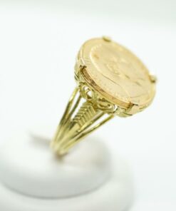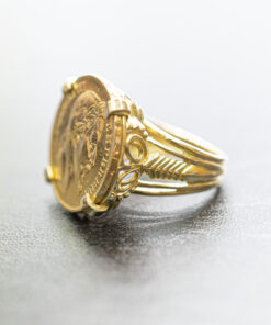 Bague chevalière en or 18 carats sertie en son centre d’une pièce de 20 Francs en or 21 carats à l’effigie de Napoléon III. La bague chevalière en or 18 carats sertie en son centre d‘une pièce de vingt franc est un bijou magnifique et prestigieux. Cette bague est idéale pour les personnes qui aiment les bijoux classiques et élégants. La bague est sertie d‘une pièce de vingt Francs en or 21 carats, ce qui lui donne un aspect unique et luxueux. Le délais de livraison est de 20 jours.