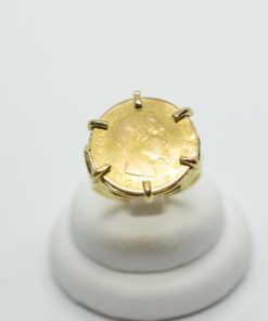Bague chevalière en or 18 carats sertie en son centre d’une pièce de 10 Francs en or 21 carats à l’effigie de Napoléon III. La bague chevalière en or 18 carats sertie en son centre d‘une pièce de dix Francs est un bijou magnifique et prestigieux. Cette bague est idéale pour les personnes qui aiment les bijoux classiques et élégants. La bague est sertie d‘une pièce de dix Francs en or 21 carats, ce qui lui donne un aspect unique et luxueux. Le délais de livraison est de 20 jours, le poids est donné de manière indicative et varie selon la taille.